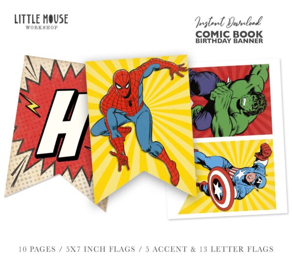 Vintage Comic Book Hero Birthday Bunting – Printable Action Superhero Party Banner with Spider-Man, Hulk, and Captain America