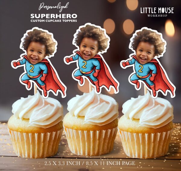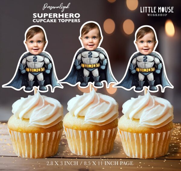 Personalized Photo Grey Suit Superhero Cupcake Toppers for Toddler Birthdays