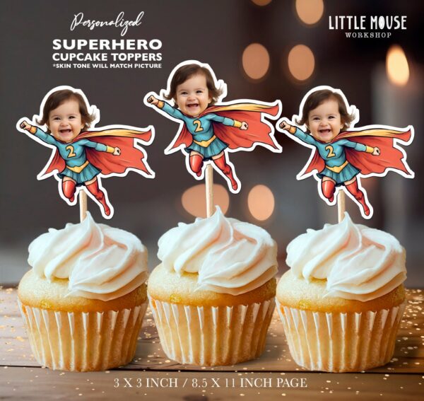 Custom Face Flying Superhero Girl Cupcake Toppers – Printable 2nd Birthday Decor