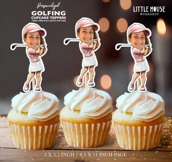 Custom Photo Lady Golfer Cupcake Toppers – Pink Golf Outfit Theme for Women’s Birthday & Retirement