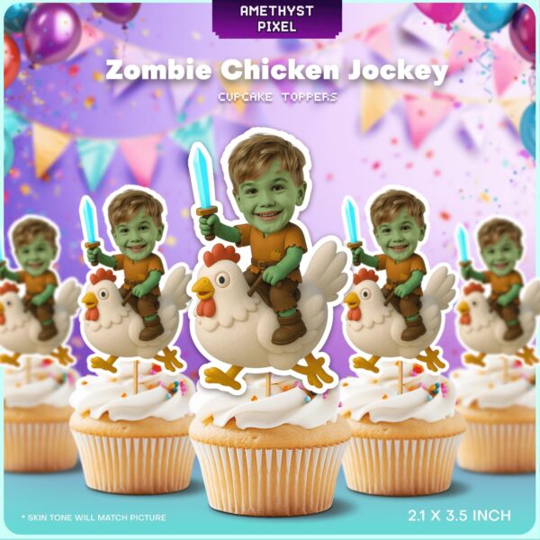Personalized Face Zombie Chicken Jockey Cupcake Toppers for Kids Gaming Party