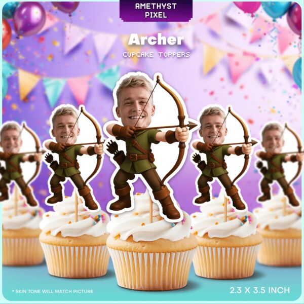 Personalized Archer Cupcake Toppers with Custom Face – Medieval Bow and Arrow Party Décor