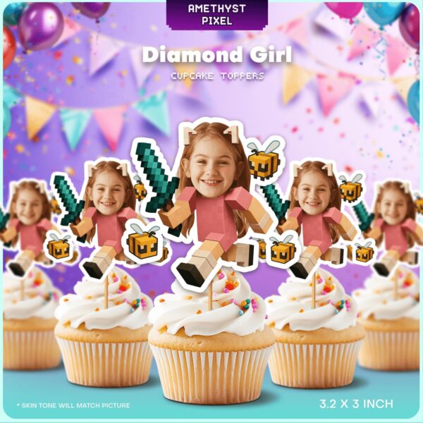 Custom Face Pixel Miner Girl Cupcake Toppers with Diamond Sword & Bee Decor