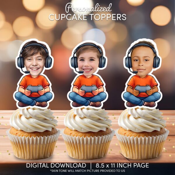 Custom Face Gamer Cupcake Toppers - Personalized Video Game Party Printable