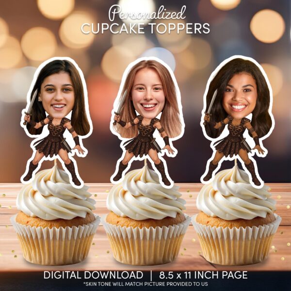 Custom Female Warrior Cupcake Toppers with Your Photo – Printable Gladiator Party Decor