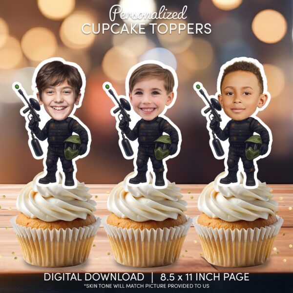 Personalized Paintball Player Cupcake Toppers - Custom Face Digital Party Decor