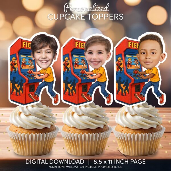 Personalized Retro Arcade Cupcake Toppers with Custom Face for Gamer Parties