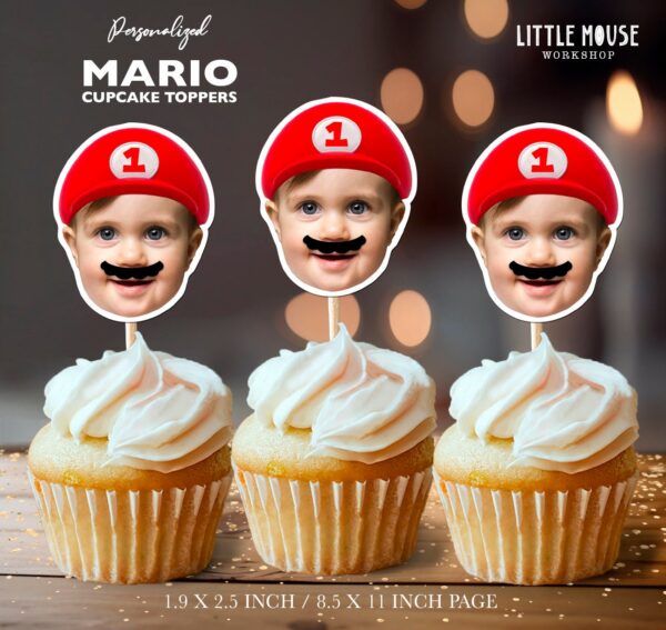 Personalized Photo Mario Theme Cupcake Toppers – Custom 1st Birthday Face Picks with Hat & Mustache