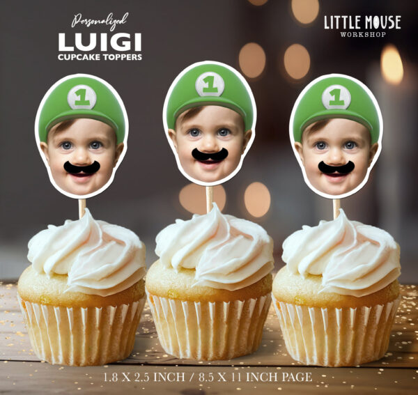 Custom Photo Luigi Theme 1st Birthday Cupcake Toppers