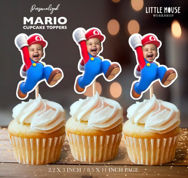 Custom Face Super Mario Theme Cupcake Toppers - Personalized Jumping Plumber Birthday Decoration