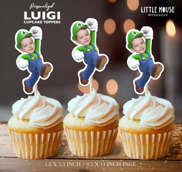 Custom Face Luigi Themed Cupcake Toppers for Video Game Birthday Parties