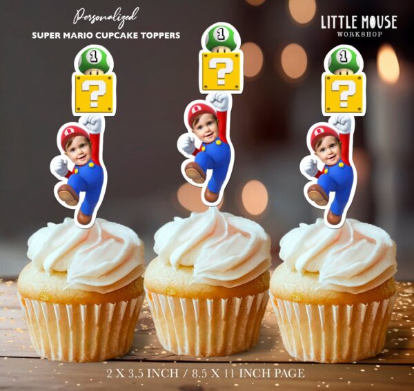 Custom Face Super Mario Cupcake Toppers – Level 1 Gamer First Birthday Decor