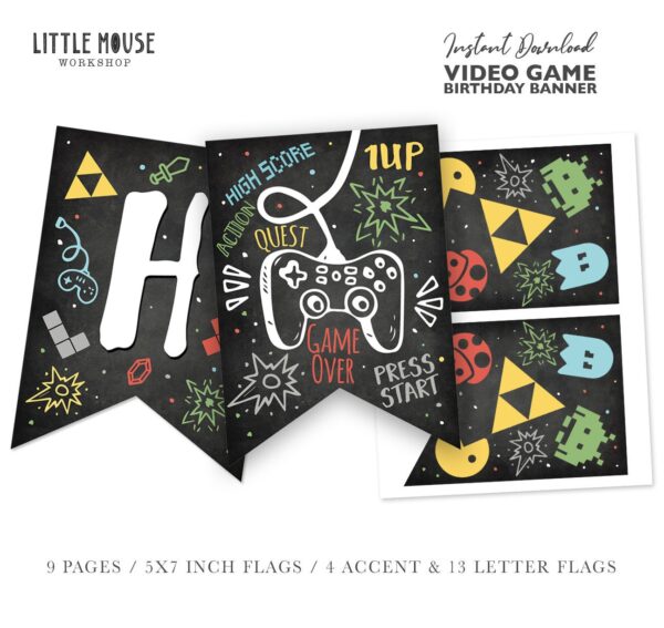 Retro Chalkboard Video Game Birthday Banner – Printable Arcade Party Bunting (5x7 Inch Flags)