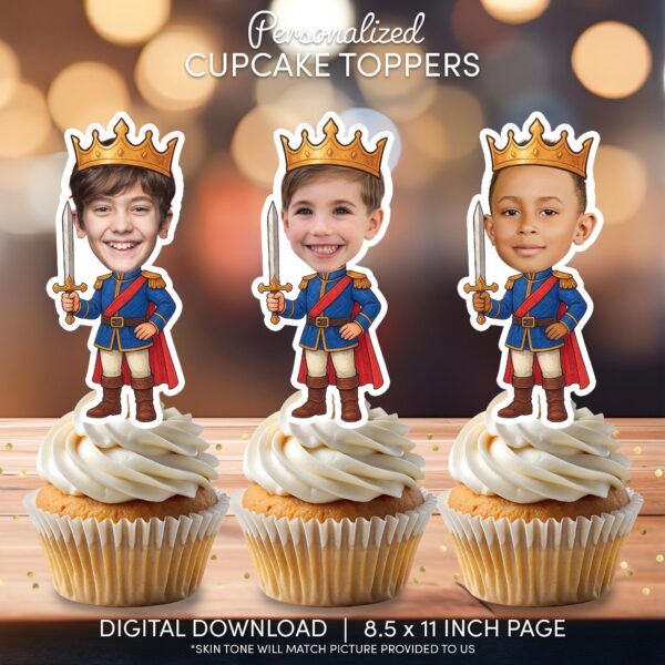 Personalized Royal Prince Custom Face Cupcake Toppers - Blue and Gold Birthday Printable