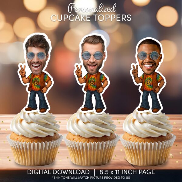 Custom Face Hippie Cupcake Toppers – Printable 60s Retro Tie Dye Party Decor