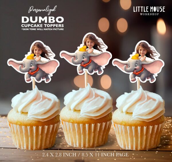 Custom Face Dumbo Themed Cupcake Toppers – Flying Elephant Circus Party Décor