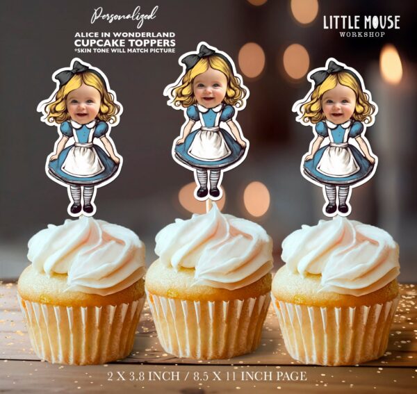Custom Face Alice in Wonderland Cupcake Toppers for Whimsical Onederland Birthdays
