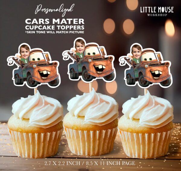 Personalized Mater Face Cupcake Toppers – Custom Tow Truck Theme Birthday Decor