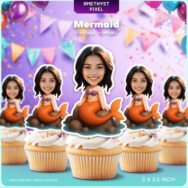 Custom Face Sitting Mermaid Cupcake Toppers with Orange Tail