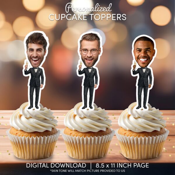 Custom Face Tuxedo Cupcake Toppers – Printable Gentleman with Champagne Party Decor