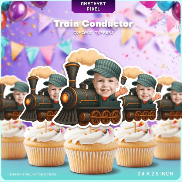 Custom Face Train Conductor Steam Engine Cupcake Toppers