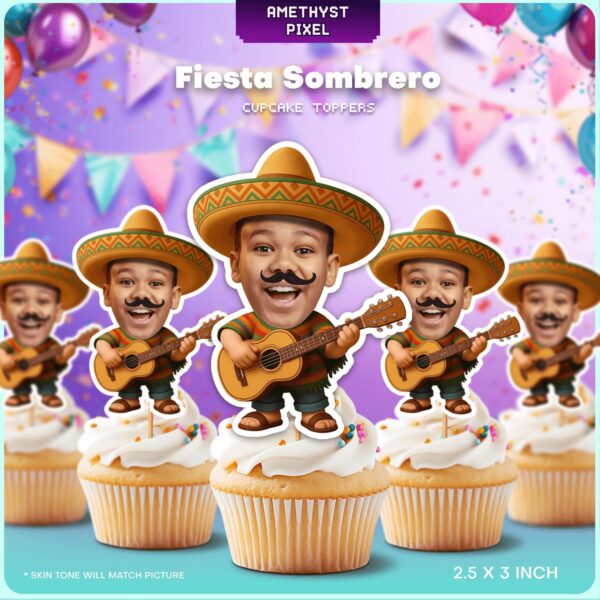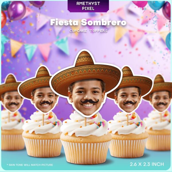 Custom Face Fiesta Sombrero & Moustache Cupcake Toppers for Mexican Themed Parties