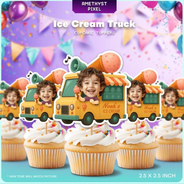 Custom Face Ice Cream Truck Cupcake Toppers – Personalized Summer Birthday Decor