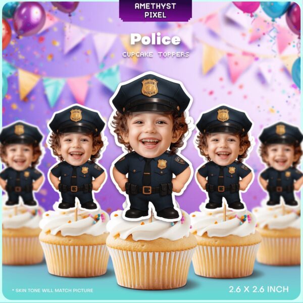 Custom Face Police Officer Cupcake Toppers – Printable Law Enforcement Birthday Decor