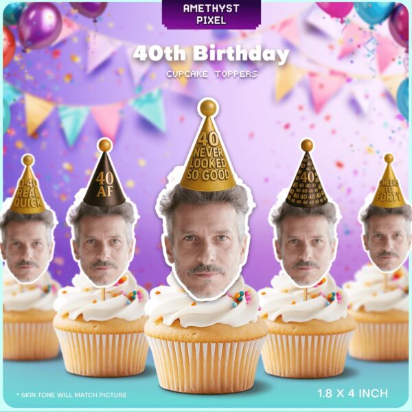Custom Face 40th Birthday Cupcake Toppers Gold Party Hat Collection