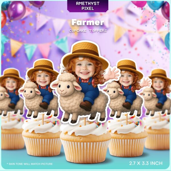 Custom Face Farmer Theme Cupcake Toppers for Barnyard Birthday Parties