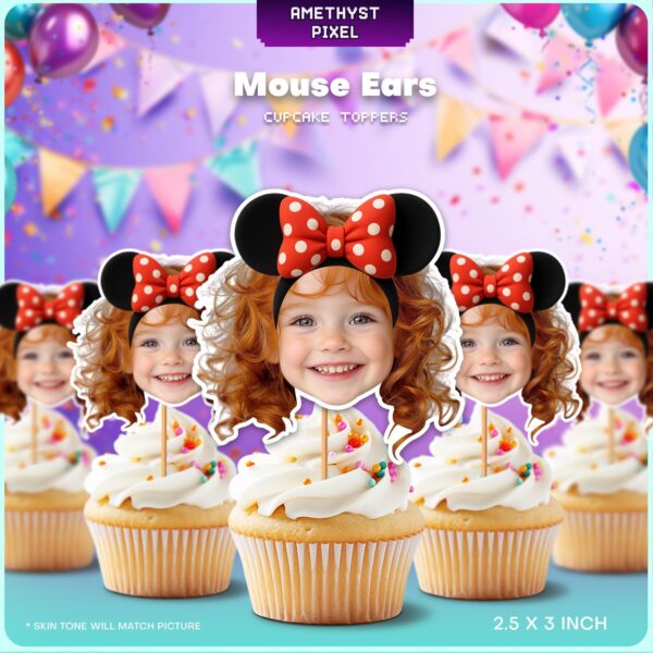 Custom Face Mouse Ears Red Polka Dot Bow Cupcake Toppers