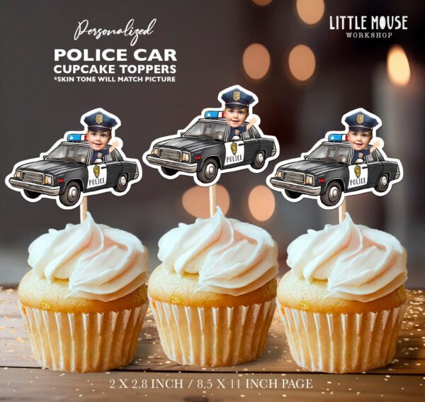 Custom Face Police Car Cupcake Toppers – Personalized Officer Patrol Party Decor