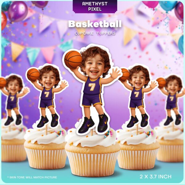 Personalized Basketball Player Cupcake Toppers Featuring Custom Face Photo in Purple Uniform