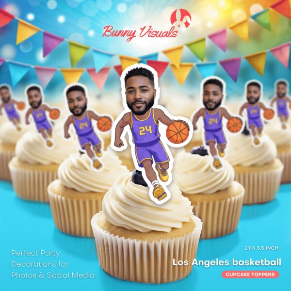 Custom Photo Face Los Angeles Basketball Cupcake Toppers – Purple Jersey Sports Theme