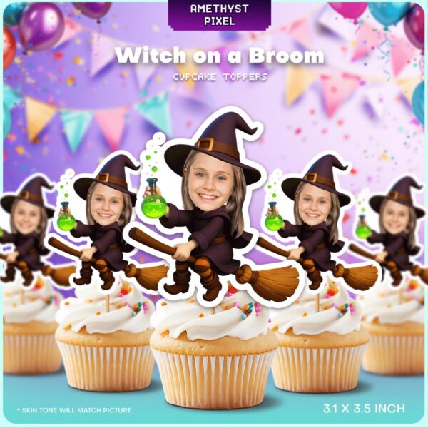 Personalized Witch Riding Broom Custom Face Cupcake Toppers for Halloween