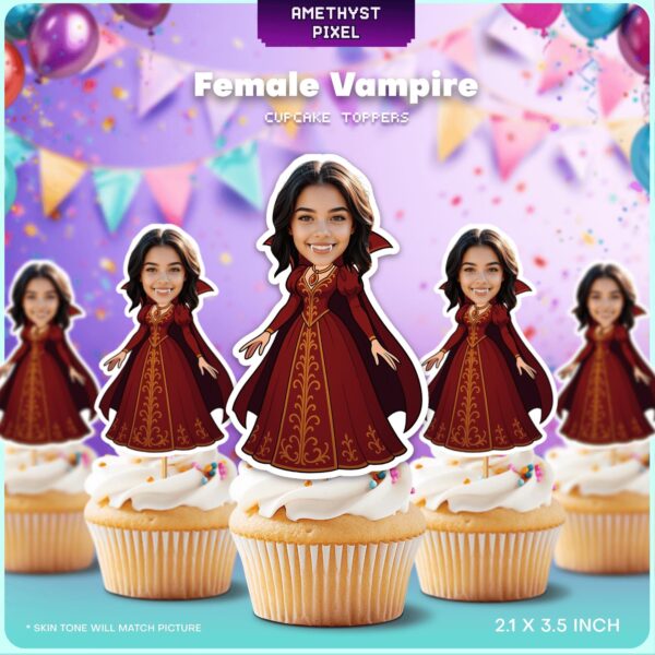 Personalized Vampiress Cupcake Toppers with Custom Face – Gothic Red Gown Theme