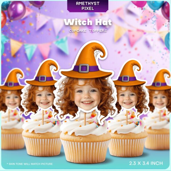 Personalized Orange Witch Hat Face Cupcake Toppers for Children's Halloween Parties