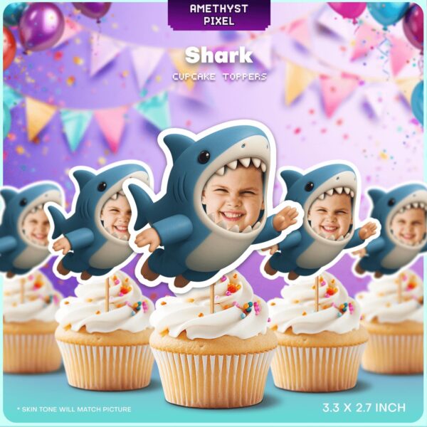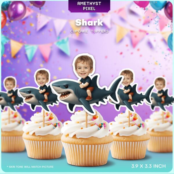 Personalized Shark Rider Cupcake Toppers with Custom Face for Ocean Birthday Parties