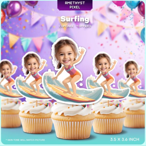 Personalized Surfing Girl Cupcake Toppers with Custom Photo Face