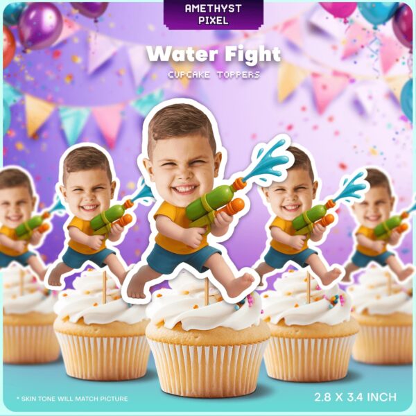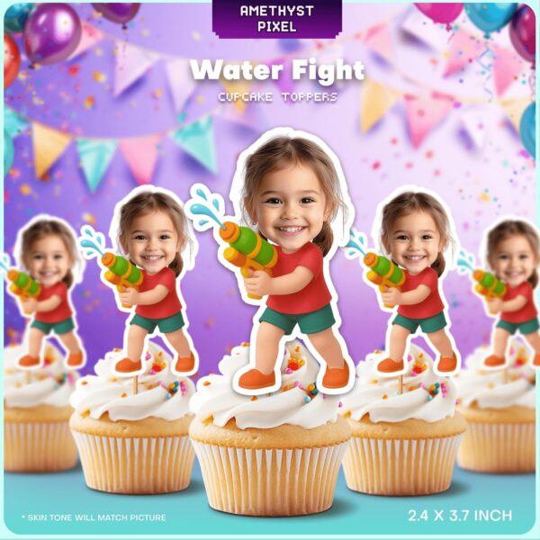 Personalized Water Gun Fight Cupcake Toppers, Custom Face Summer Splash Decor