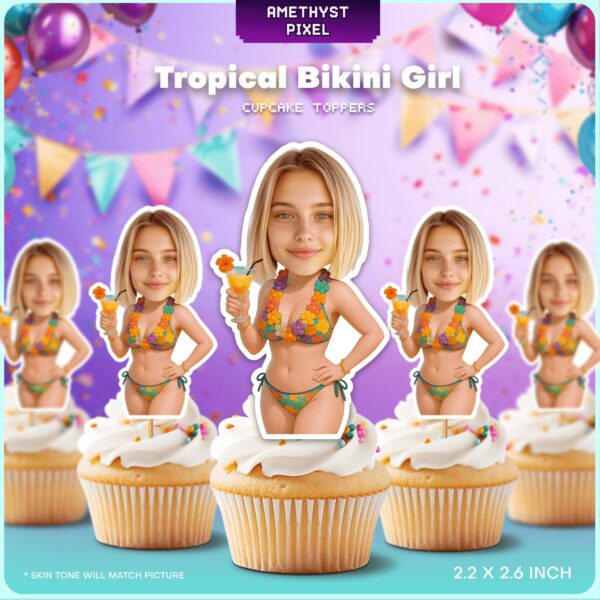 Custom Face Tropical Floral Bikini Cupcake Toppers for Summer Pool Parties
