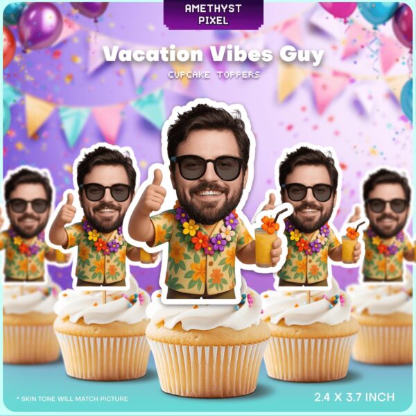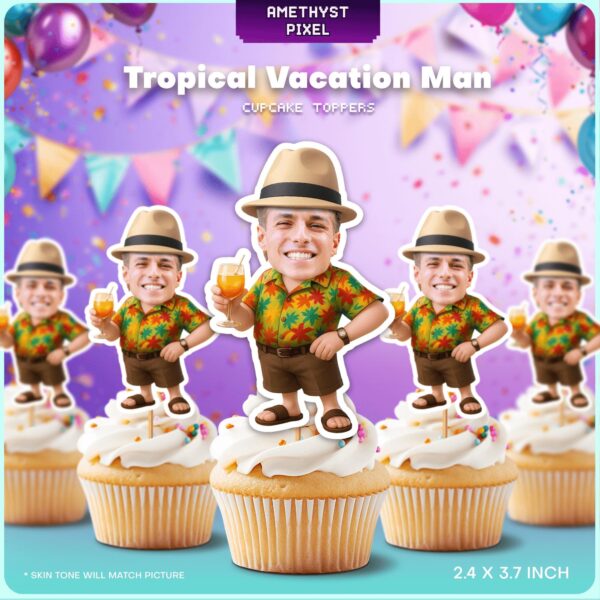 Custom Face Vacation Vibes Guy Tropical Cupcake Toppers