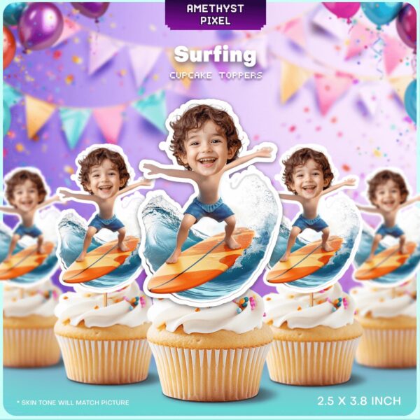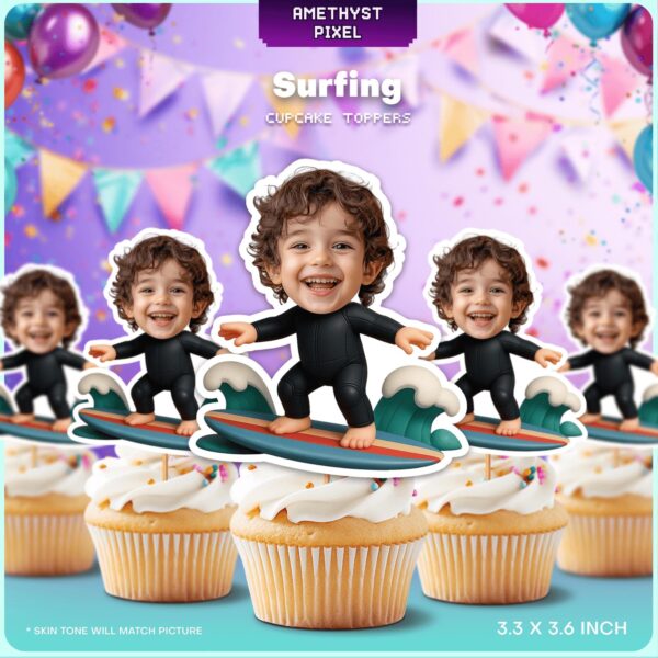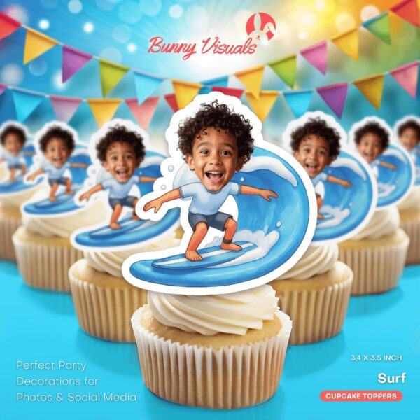 Custom Face Surfer Boy Cupcake Toppers – Personalized Beach Theme Birthday Decor