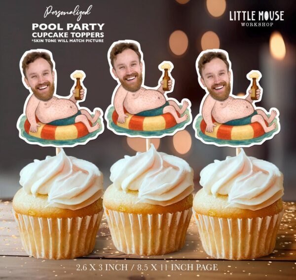 Custom Face Men's Pool Party with Beer Cupcake Toppers for Adult Birthdays