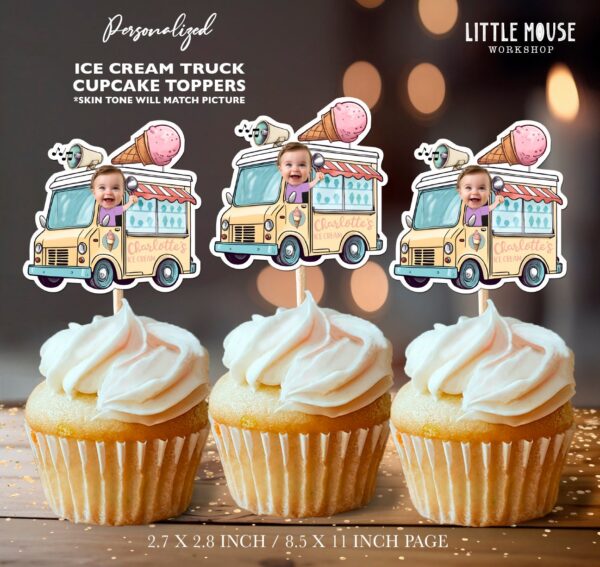 Personalized Custom Face Ice Cream Truck Cupcake Toppers for Summer Birthdays